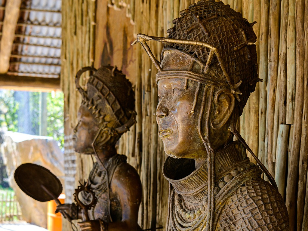 The atmosphere is enhanced by massive rocks, bronze statues of a king and queen from Nigeria, and creative artistic elements.