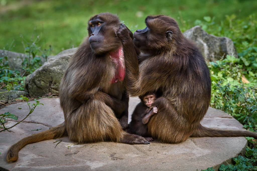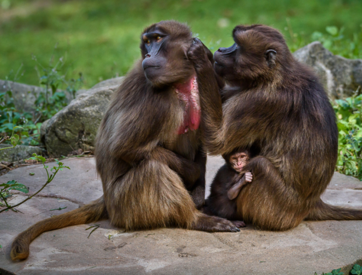 Geladas have one of the largest grassy enclosures, as they are feeding specialists who spend the entire day grazing on grass.