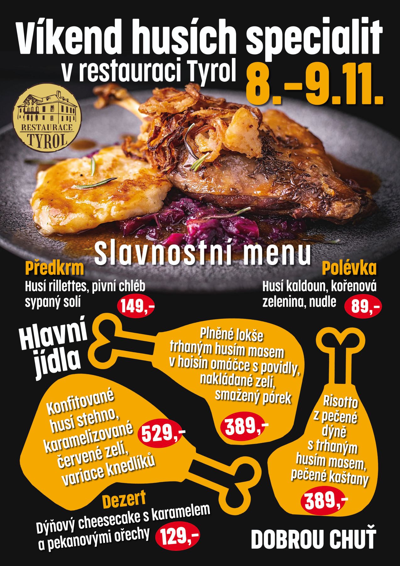 Na sobotu 8. a neděli 9.11. pro vás restaurace Tyrol připravuje víkend husích specialit. Nabídka je opravdu lákavá, nenechte si ji ujít!
