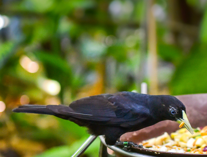 Vlhovec žlutohřbetý je poměrně štíhlý pěvec s dlouhým ocasem, modrýma očima a světle žlutým silným zobákem. Samice jsou vždy o něco menší a jejich zbarvení není tak výrazné. V období hnízdění vytváří velké kolonie. Na jednom stromě tak může být až stovka hnízd. Každé hnízdo má tvar podlouhlého vaku o délce 40 cm a je zavěšené až na samém konci větve. Vchod je umístěn nahoře. O stavbu hnízda, sezení na vejcích i o výchovu mláďat se stará výhradně samice.